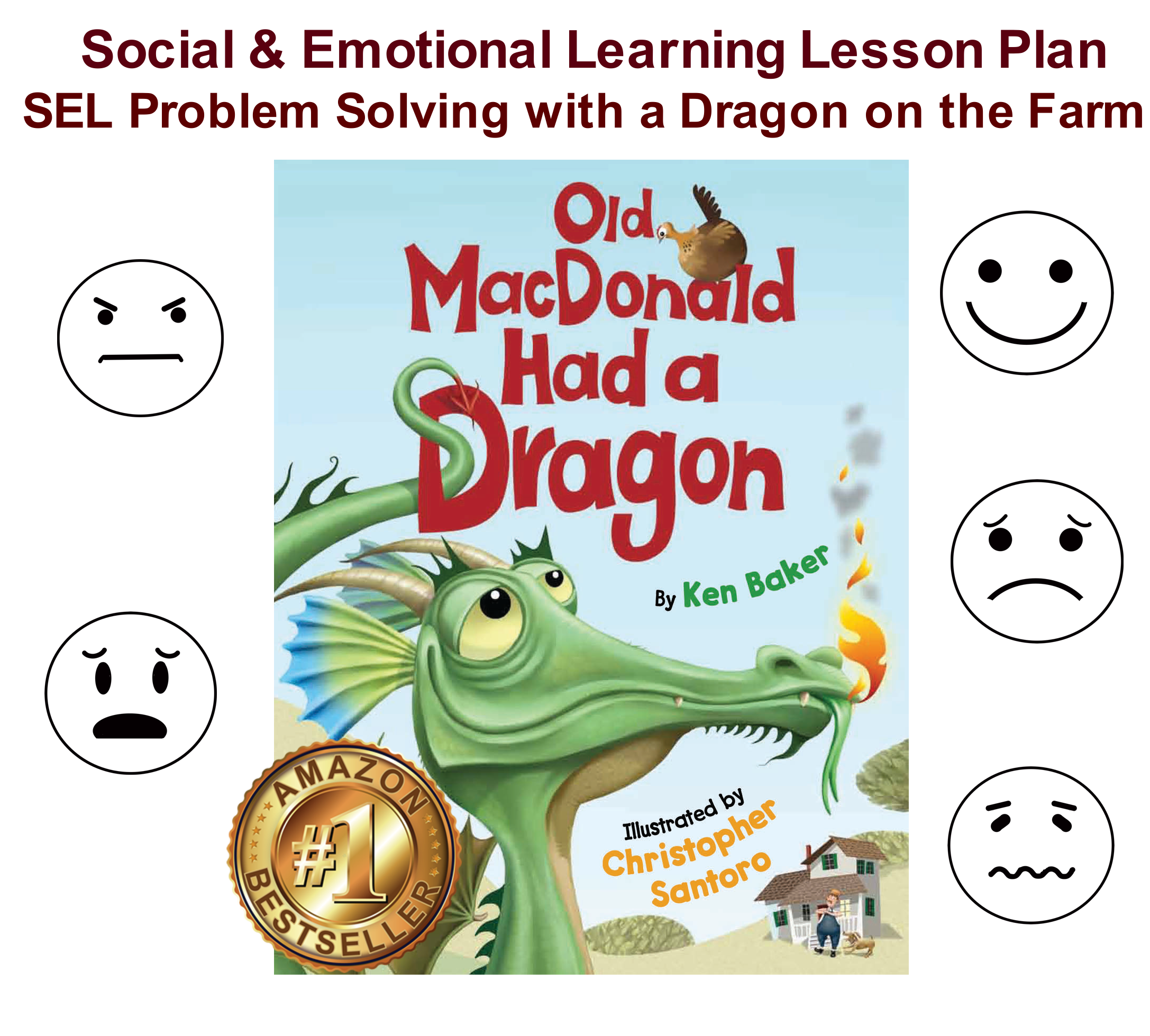 Objective of SEL problem solving and strategy planning lesson plan: Help students explore and develop problem‐solving skills, emotional self-awareness, self-management, teamwork relationship skills, and responsible decision‐making by discussing and planning how Old MacDonald could have better dealt with the problem of his dragon eating the animals on the farm.